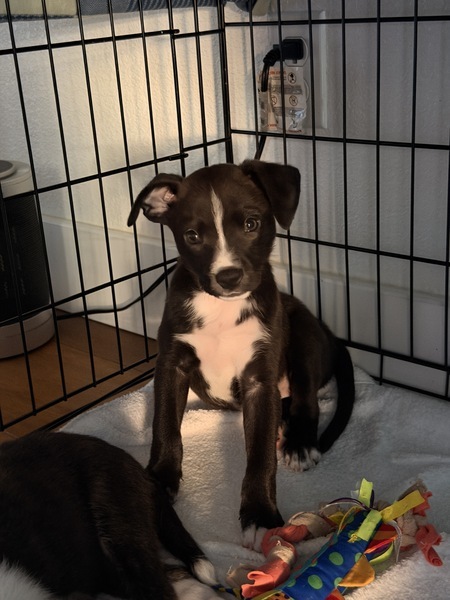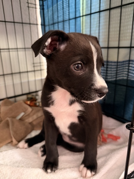 | Do you need a puppy that will watch TV with you on the couch? That's me! My foster family taught me how to play, but I still love lazing the day away! Toys and sleeping make me happy, but most of all, I know I will love cuddling all day and night in my new home! Primary Color: Black Secondary Color: White Weight: 8lbs Age: 0yrs 0mths 8wks Animal has been Spayed | |